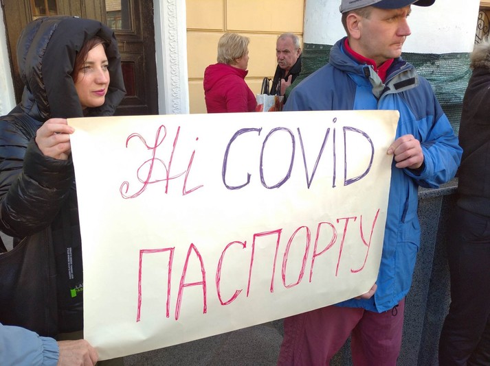 Люди стоять з плакатами, на яких написано «Скажи ні обов’язковій вакцинації», «Скажи ні Covid-паспортам», «Скажи ні Covid-фашизму» та ін.
