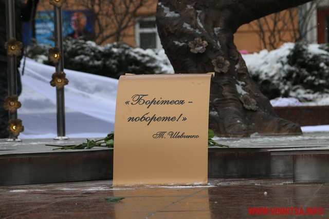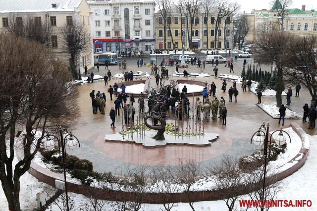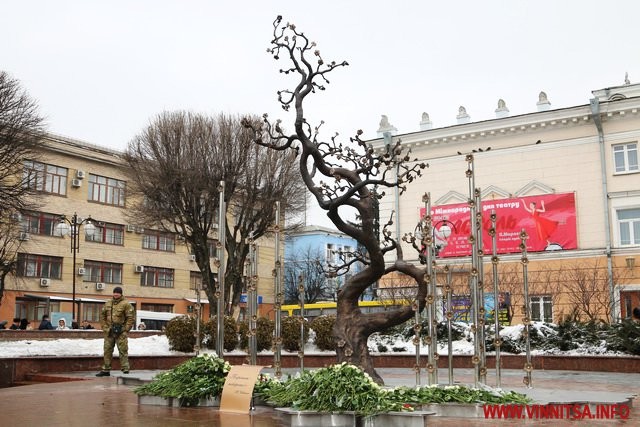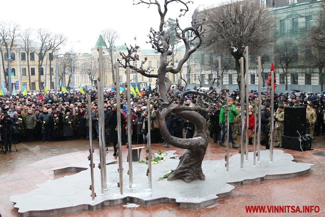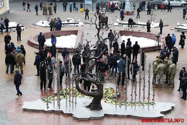 30 родин загиблих Героїв Небесної Сотні з вінничанами і представниками влади 23 лютого відкрили на однойменній площі у Вінниці пам’ятний меморіал «Дерево Свободи».