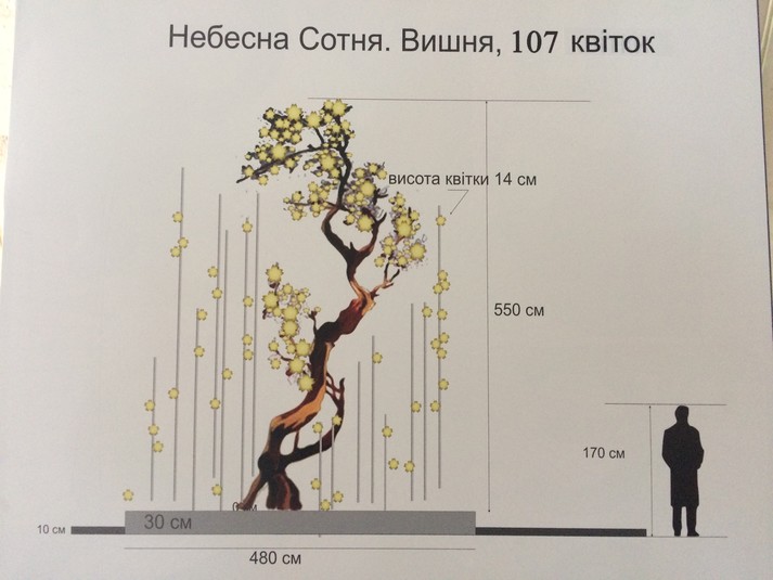 За короткий час, який залишився до чергових роковин найбільш трагічних подій Революції Гідності, підрядна організація, з якою благодійні фонди уклали договір, має змонтувати не лише 5,5-метровий бронзовий пам’ятник у вигляді вишневого дерева, з якого опадає цвіт, але й підніжжя композиції – це карта України, з якої «проростає» вишня. 107 падаючих квіток символізуватимуть Героїв, загиблих під час кривавих розстрілів на Майдані зимою 2014-го. Загальна вага композиції становитиме понад 800 кг.
