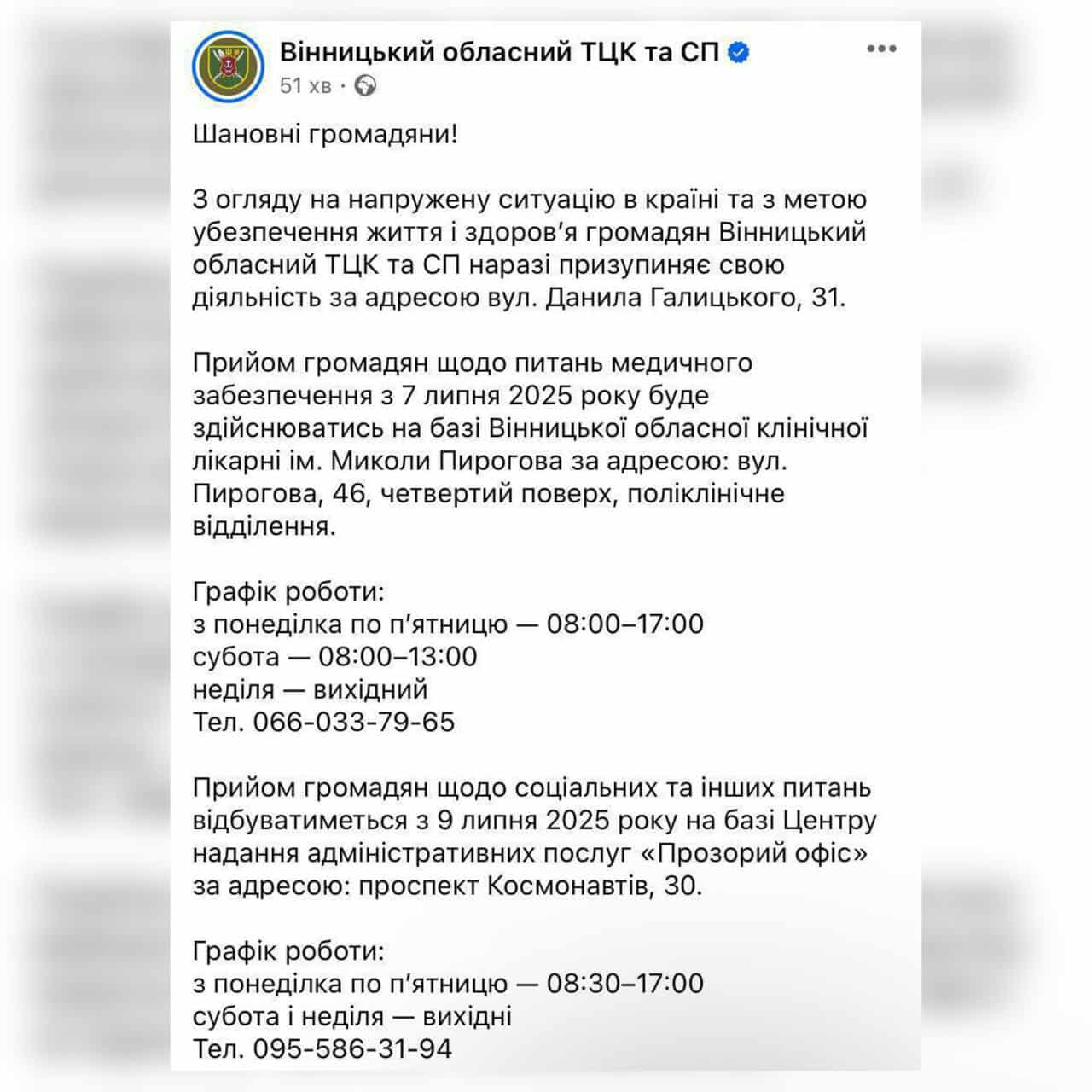 «З огляду на напружену ситуацію в країні наразі вживаються заходи щодо мінімізації негативних наслідків можливих обстрілів, які агресор спрямовує проти територіальних центрів комплектування та соціальної підтримки. Задля убезпечення життя і здоров'я цивільних громадян особовий склад Вінницького ОТЦК та СП був розосереджений. Заходи мобілізації тривають відповідно до плану», – йдеться у дописі.