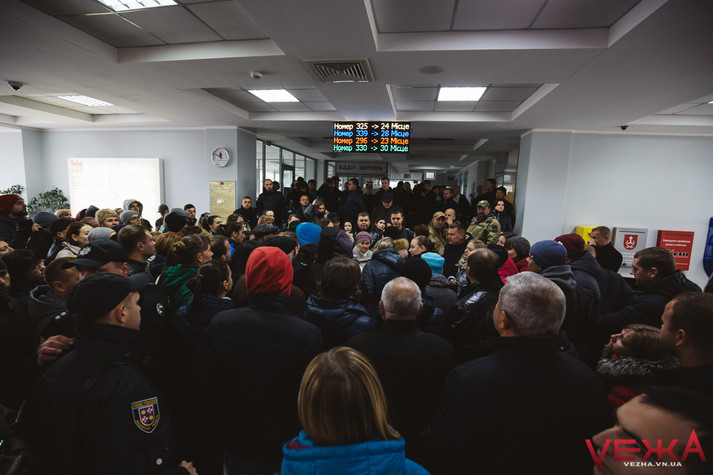 Тож спершу мітингарі зібрались під стінами ВМР, а потім перекрили вулицю Соборну, рухаючись по пішохідному переходу. Через хвилин 15 люди перейшли до приміщення міської ради із вимогою, щоб до них вийшов хтось із представників влади.