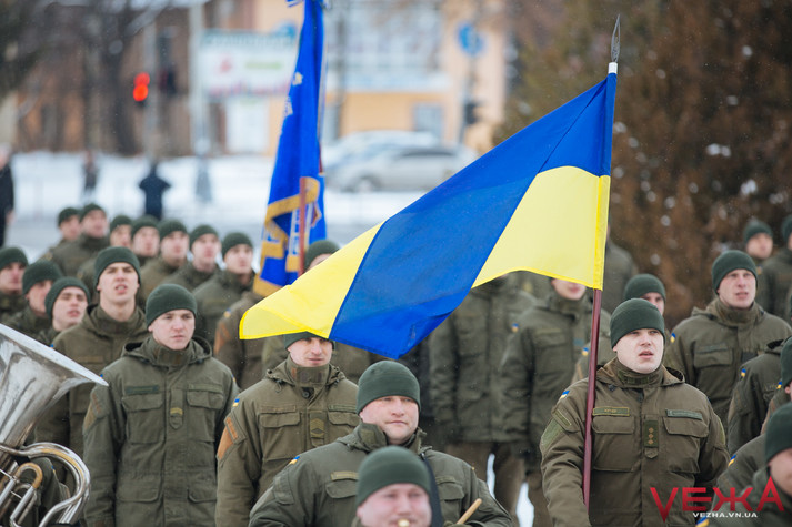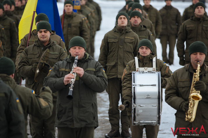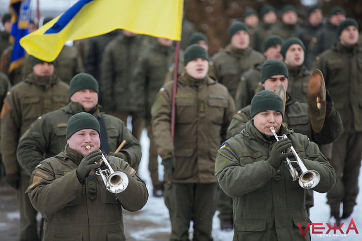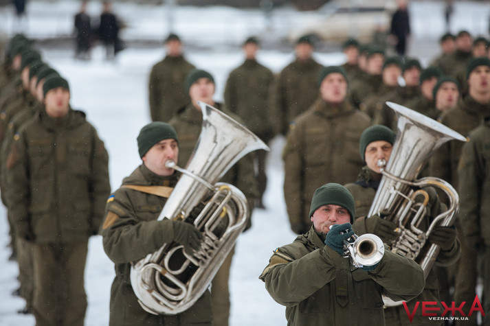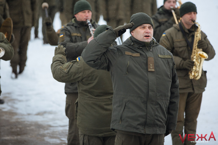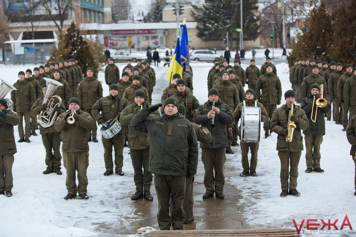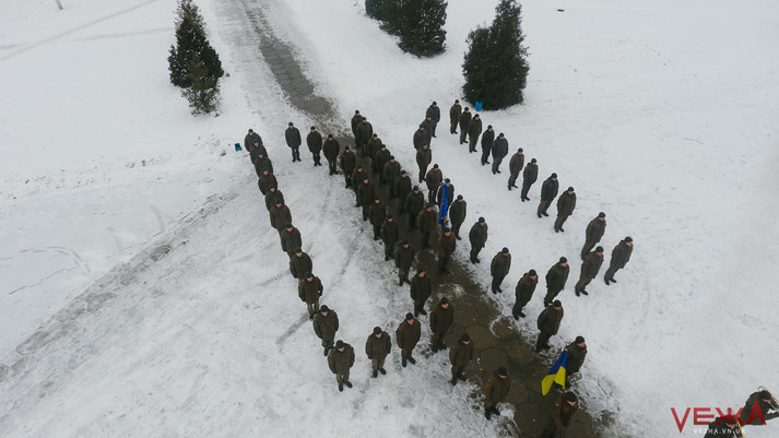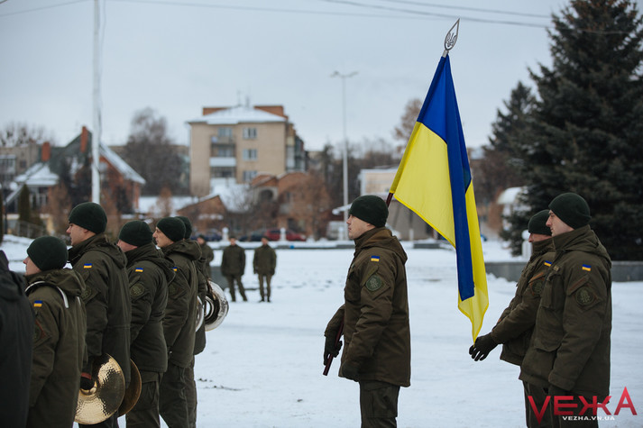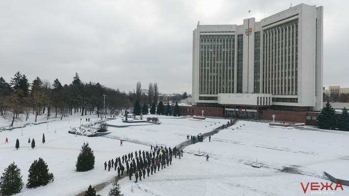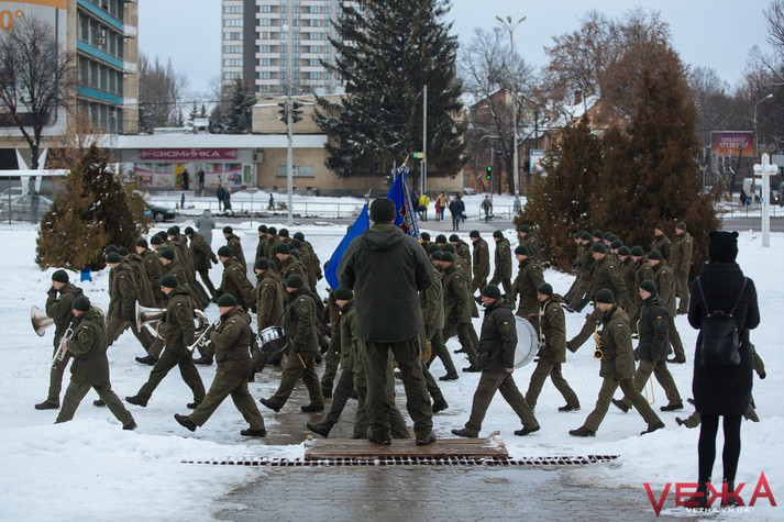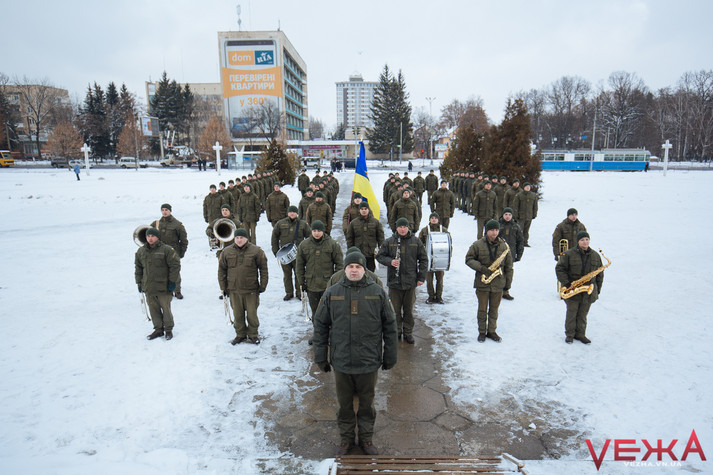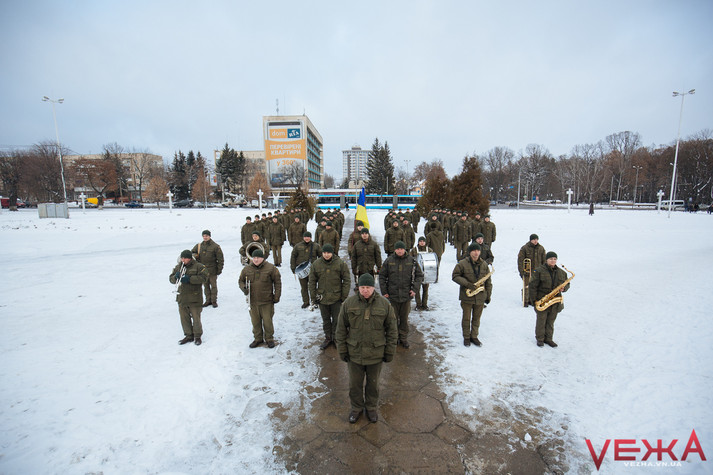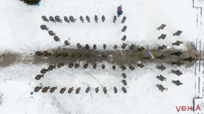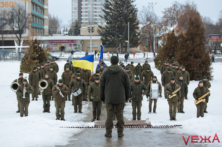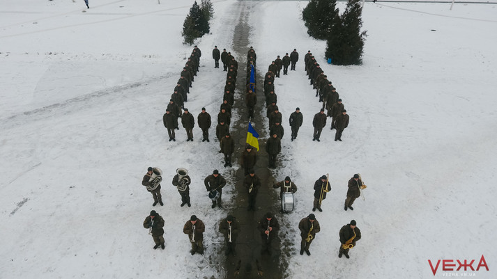 Вісім десятків бійців у супроводі військового оркестру стали у формі тризуба на засніженій площі Стуса. Як пояснив полковник Віталій Соколюк, котрий і керував усім дійством, подібні флешмоби наразі відбуваються по всій країні, аби підтримати моряків, «які показали доблесть і відвагу під час проходу Керченською протокою і навіть перебуваючи в полоні, лишаються вірними присязі та демонструють незламність духу».
