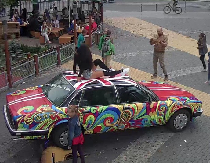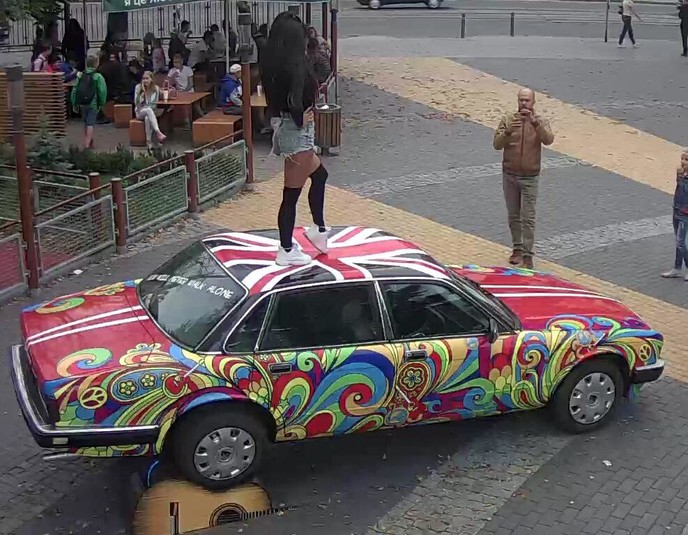 Поки дівчину, що позувала на раритетному «Jaguar», що стоїть у центрі міста, з іншого ракурсу знімала, ймовірно, камера спостереження, встановлена на локації. На одній світлині дівчина лежить на ексклюзивному авто, поки її фотографує хлопець. На іншій світлині вона вже стоїть на даху машини.