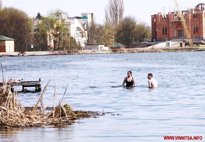 Вінничани вже відкрили сезон купання на Вишенському озері. Правда, охочих пірнути в холодну воду ще одиниці, однак позасмагати – значно більше.