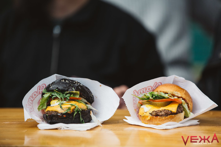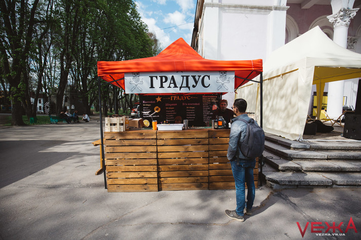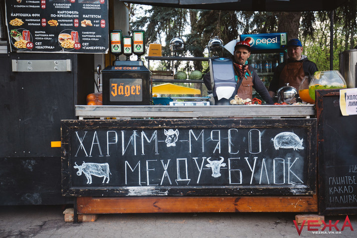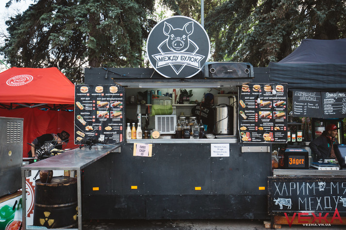 Проходимо далі за сцену – і помічаємо ятку… «Между булок». Подумалося – чи вирішив вінницький заклад повернути стару назву? Виявилося, що це гості з Харкова: продають бургери, м’ясо і алкогольні коктейлі під гаслом «Жарим мясо между булок». Креативненько…