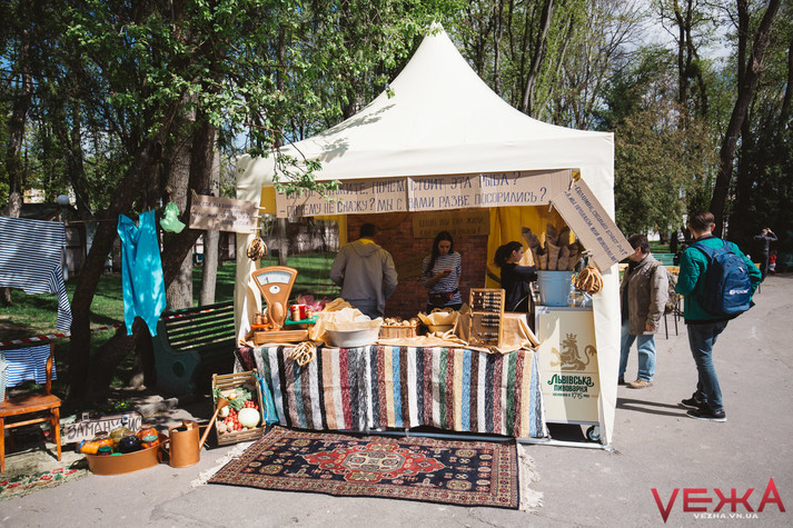 Симпатична дівчина з рожевими тінями на очах намащує шматочок багету форшмаком (15 грн) і з усмішкою простягає канапку черговому покупцю. Поруч хлопець, який просить його не фотографувати («Бо мене розшукує Інтерпол»), насипає горіхи в гранатовому соусі в паперовий пакетик – «60 гривень на організм».