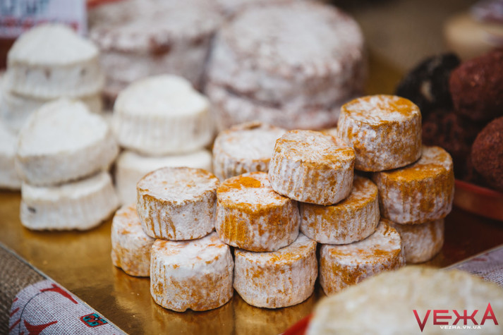 Особливо велика черга – біля сирів з Житомирщини: тут сир продають з козиного та коров’ячого молока. Аромат – специфічний. Продавчиня дає скуштувати: якщо ви любитель справжнього «живого» сиру – вам очевидно сподобається.