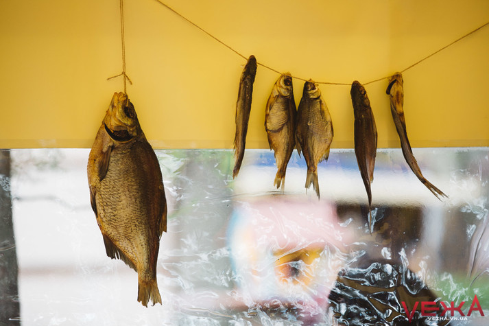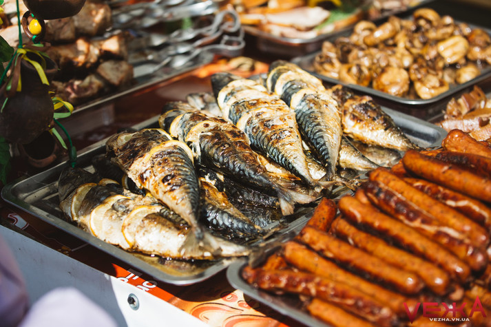 За ними – кияни з яткою «Козацька втіха»: тут купа ковбас (35 гривень за 100 грамів), скумбрія на грилі (40 гривень за 100 грамів або 150 грн. ціла рибина), дуже апетитне сало – 30 гривень за 100 грамів.