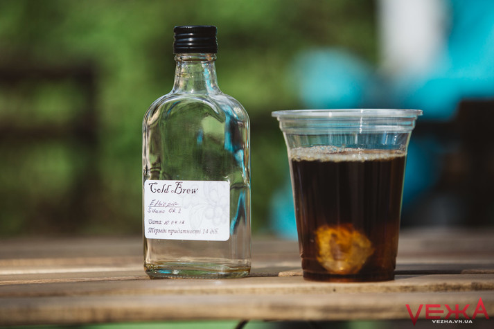 Ідемо далі та знаходимо старих-добрих баристів з «Чорної кішки-білого кота». Тут найвідоміша вінницька кава і маса десертів. Трохи далі продають каву холодну – всього за 25 гривень разом зі скляною пляшечкою.