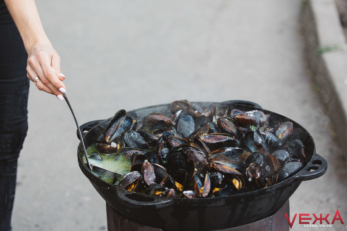 Неподалік від гостей із Сакартвело – намет ресторану «Канапе», що з вулиці Зодчих. Вони сьогодні спеціалізуються на морепродуктах: равлики з горгонзолою (30 грн. штука), рапани та мідії. І це далеко не все з їхнього асортименту. Припрошує скуштувати смаколики сама власниця ресторану: неможливо відмовити, особливо, коли пригощають.)