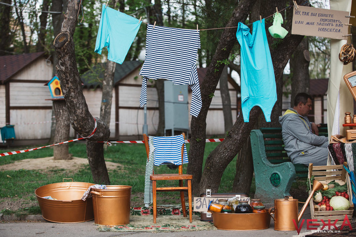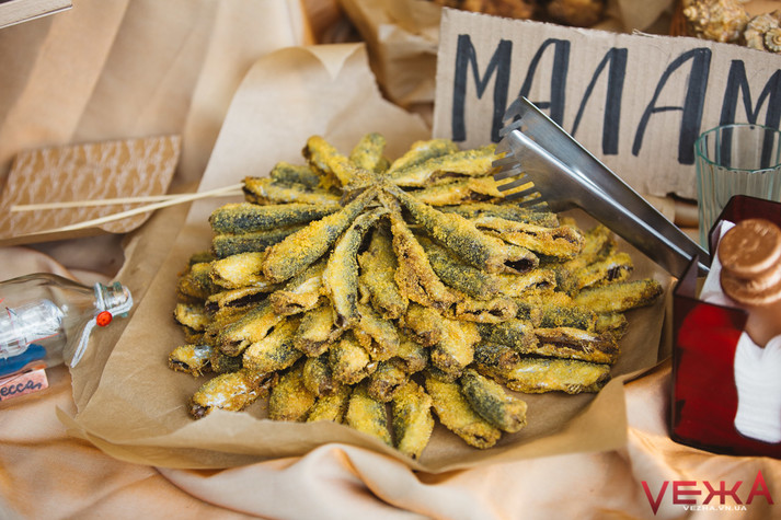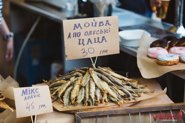 Нас дуже привабила одеська ятка від вінницької кейтерингової компанії «Моментс»: тут килим на «вході», розвішані тільняшки, красиві дівчата і мойва з креветками.