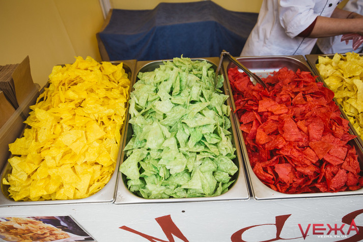 Біля Літнього театру – «друга черга» фесту. Відразу помічаємо яскраву ятку з кукурудзяними чіпсами різних кольорів: смаки є від «з паприкою» до «з холодцем». Продають за 40 гривень 100 грамів.