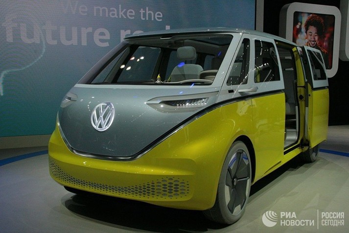 Німецький бренд Volkswagen привіз на автосалон I.D.Buzz. Це - шоу-кар. Його вже показували в Детройті. Мобільна житлова кімната на вісім осіб- так характеризує виробник салон концепту.