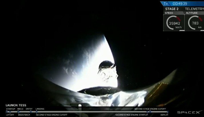 За повідомленнями SpaceX, після відокремлення перший ступінь ракети успішно приводнився в Атлантичному океані. Також було підтверджено і відокремлення другого ступеня ракети. Приблизно через годину після старту ракети, який відбувся о 1:51 за київським часом, телескоп TESS вийшов на задану орбіту.