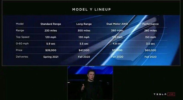 Найдешевша Model Y (зі стандартним запасом ходу) вийде навесні 2021 року і буде коштувати $39 тисяч. Найдорожча - Performance - восени 2020 року, за неї попросять $60 тисяч. Запас ходу складе 451 км, а максимальна швидкість - 241 км/год (розгін до 100 км/год за 3,5 секунд).