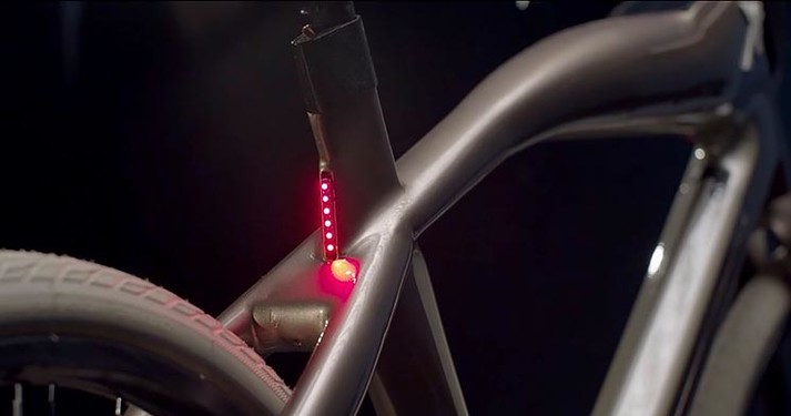 Також в раму інтегрована LED-фара та задній ліхтар, які включаються за сигналом від датчика освітленості. В кермо вбудовані ще два світлодіоди, якими можна подавати сигнали при повороті. Щоб активувати їх, кнопки не потрібні — камера велосипеда розпізнає поворот голови.