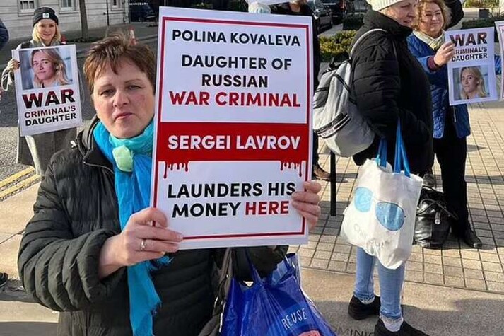 «Поліна Ковальова, донька російського воєнного злочинця Сєргєя Лаврова, відмиває гроші тут», – написали демонстранти на одному з плакатів.