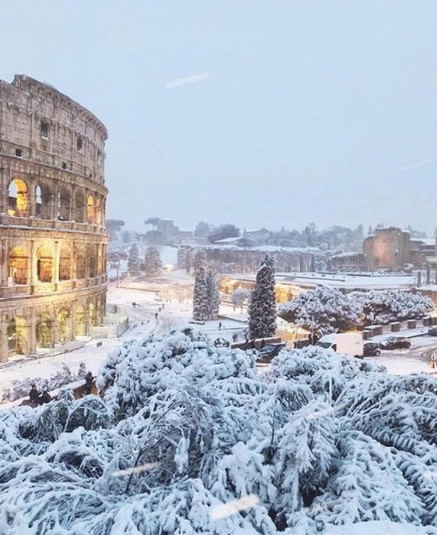 На Апеннінах аномально низька температура призвела до рідкісного погодного явища: рясний сніг випав у понеділок в Римі. Фото засніжених вулиць та пам’яток викладають користувачі соцмереж.
