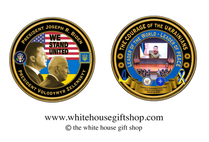 «У пристрасній промові в стилі Черчилля через Zoom зі свого офісу в Києві президент Зеленський викликав захоплення депутатів обох сторін, щоб зробити більше для захисту своєї країни та народу від жорстокої агресії Росії. Це був надзвичайно прямий заклик до дій з боку лідера часів війни, який стверджував, що допомога Україні була моральним імперативом для країни, яка проголосила себе як маяк свободи та демократії для всього світу», – зазначається в описі до монети на сайті сувенірної крамниці Білого дому.