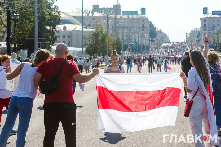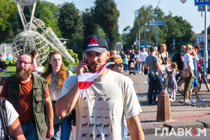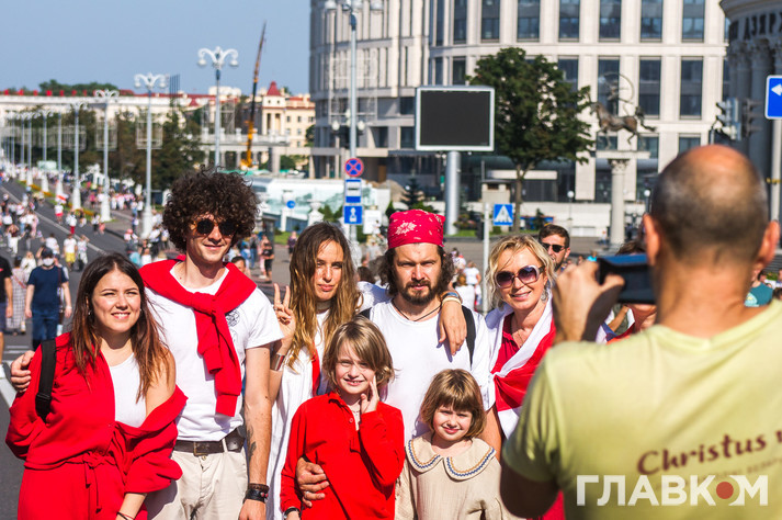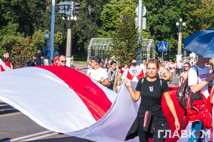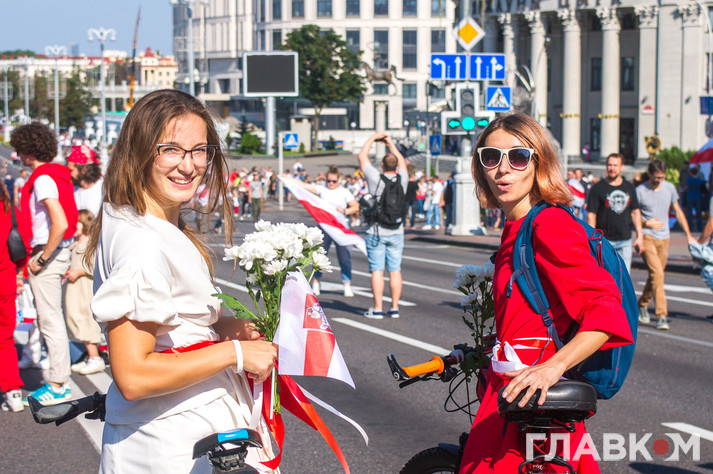 На тротуарах толпа, но всем ясно, кому это адресовано: только что на огромную и пустую проезжую часть вышли две девушки с двумя флагами – красно-зелёным и бело-красно-белым. Флаги связаны узлом, один из них официальный, второй – национальный и считающийся оппозиционным.