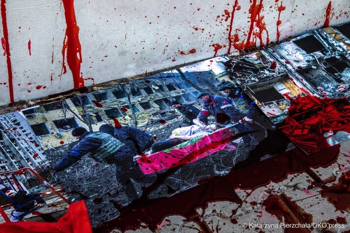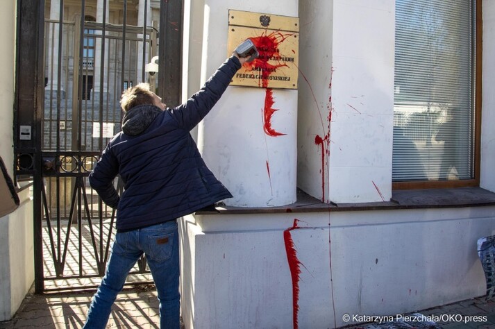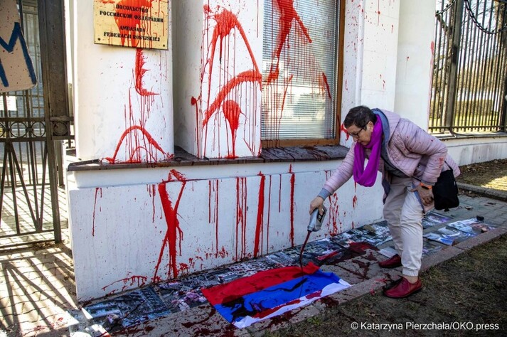 У столиці Польщі Варшаві група людей облила червоною фарбою огорожу будівлі російського посольства на знак протесту проти повномасштабного вторгнення в Україну та військової агресії. Про це повідомляє око.press.