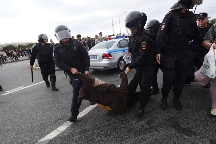 Мітинг проти пенсійної реформи розпочався в Петербурзі на площі Леніна о 14.00. Висловити протест зібралися кілька тисяч городян. Влада до заходу підготувалися і підвезла до місця колючий дріт, підігнали поливальні машини. Також виявилися перекриті під'їзди до площі Леніна, обмежили рух і по Літєйному мосту. При першому затриманні в хід пустили димову шашку.
