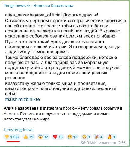 Молодша донька ексочільника Казахстану Нурсултана Назарбаєва Алія вперше прокоментувала трагічні події, що відбулися на початку року в країні. Відповідний допис кінопродюсерки та, за деякими даними, мультимільйонерки, опубліковано на її Facebook-сторінці.