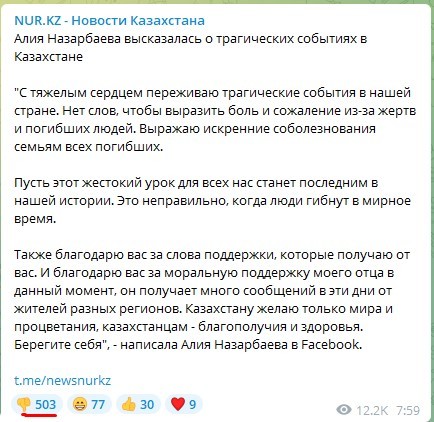 Показово, що у казахстанських Telegram-каналах, які розповсюдили звернення Назарбаєвої, переважна більшість реакцій читачів на звернення була негативною. А у деяких невдовзі було вимкнено можливість коментування.