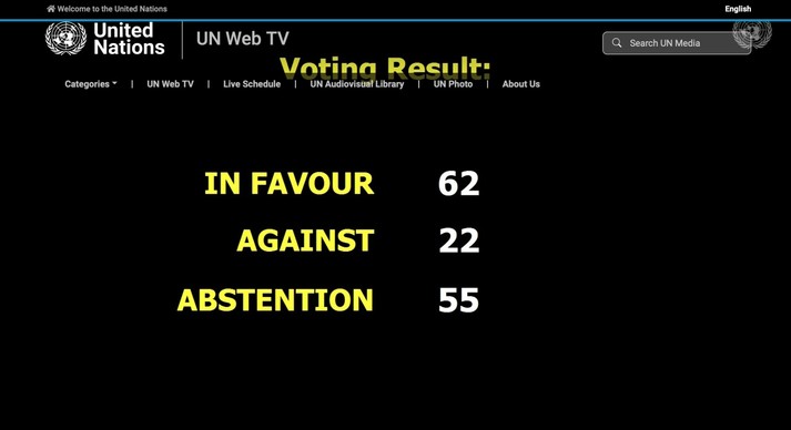 «Результати голосування наступні: за – 62, проти – 22, утримались – 55. Проєкт резолюції A/76/L.22 приймається», – заявив очільник Генеральної асамблеї ООН Абдула Шахід.