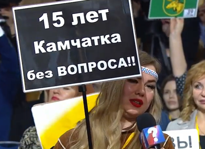 Для того, щоб звернути на себе увагу Путіна та його прессекретаря Дмитра Пєскова журналісти вдавалися до всіляких хитрощів: провокаційні плакати, хустки із принт-фотографією Путіна, ікони. Очевидно, переможцем негласного конкурсу «впади в око Пєскову» стала журналістка камчатського видання: мало того, що одягла етнічний костюм, вона ще й взяла до рук табличку «15 років Камчатка без питання».