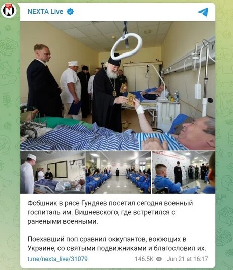 Зазначається, що патріарх російської церкви подякував пораненим російським військовим «за подвиг».