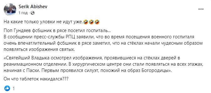 Також у пресслужбі церкви заявили, що під час візиту Кирила у госпіталі на склі «проявилося зображення Богородиці».