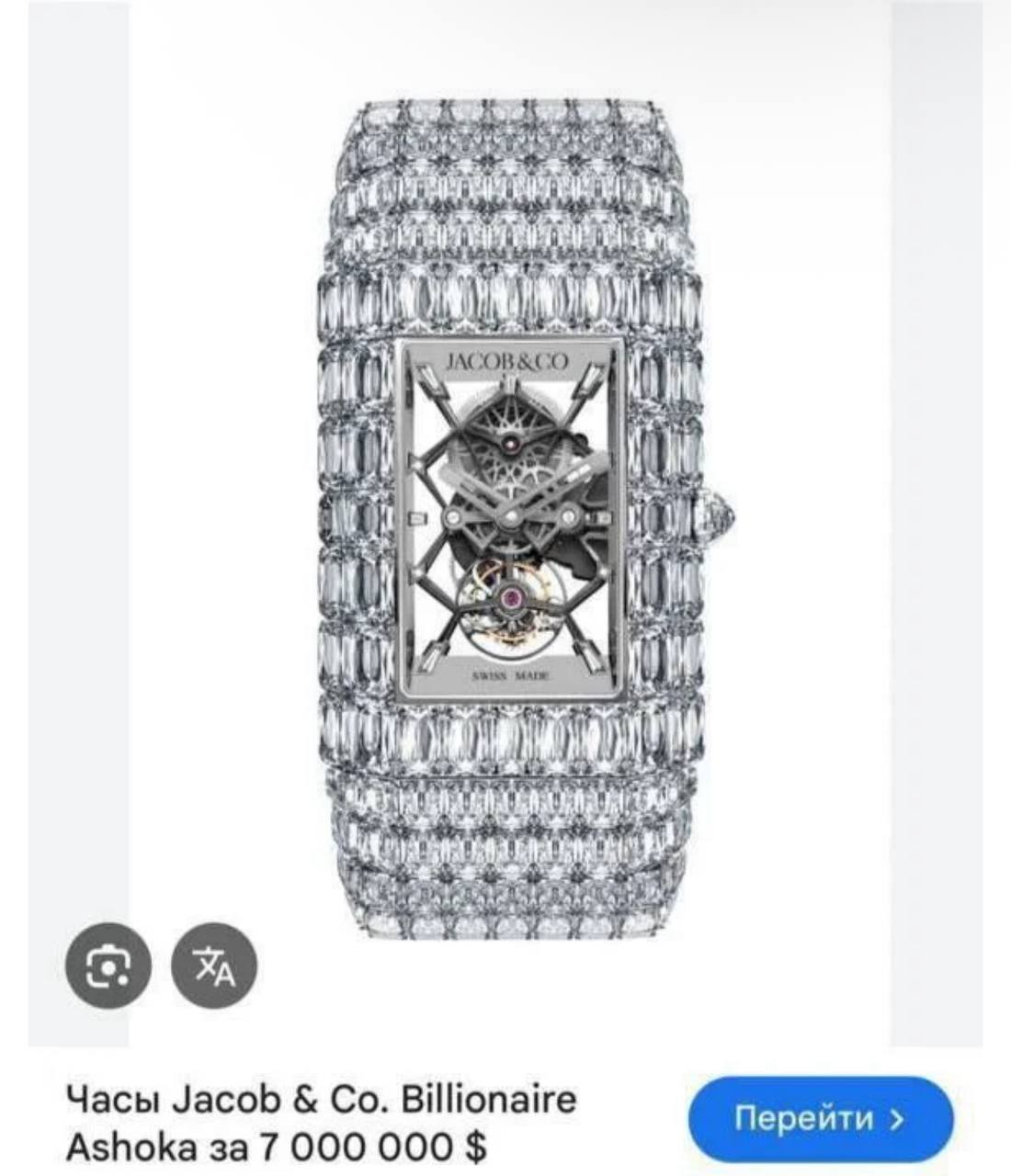На фото, яке з’явилося в мережі Адам Кадиров позує з кимось з гостей свого весілля. Годинник, який одягнений на ліву руку, моделі Billionaire Ashoka. Ця модель відома тим, що має корпус із білого золота. Корпус і браслет годинника інкрустовані 300 діамантами смарагдового огранювання. Вартість моделі складає 7 млн дол., що робить її однією з найдорожчих у модельному ряду Jacob & Co.