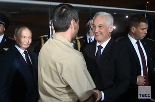 Разом із російським президентом звільнених громадян РФ зустрічали голова Служби зовнішньої розвідки Сергій Наришкін та міністр оборони РФ Андрій Білоусов.