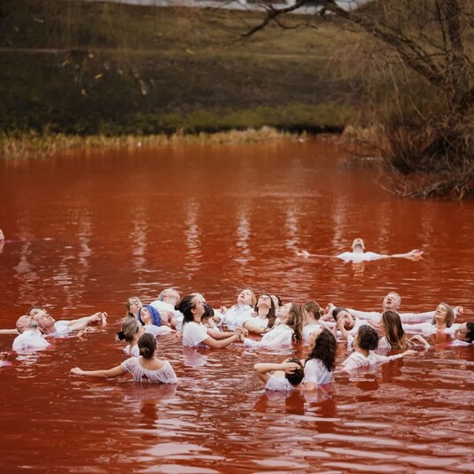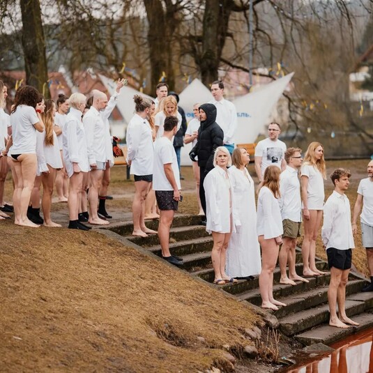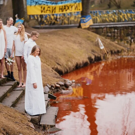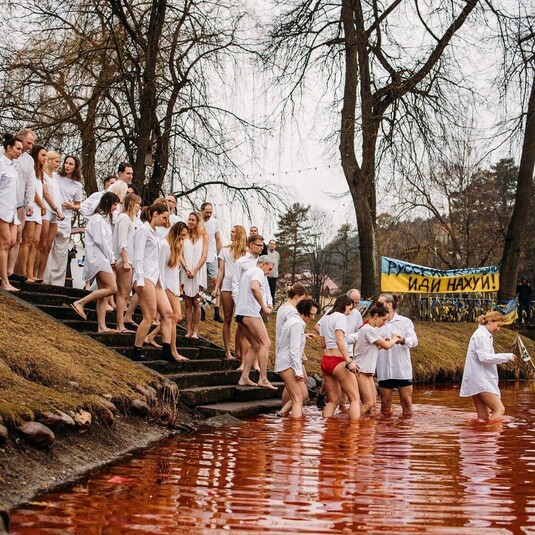 Мешканці Вільнюса вирішили скупатися у «кривавому озері», що біля російського посольства в Литві. Чоловіки та жінки у білому вбранні зайшли у холодну воду червоного кольору, яка символізує кров невинних людей, убитих в Україні російською армією. Про це ідеться на сторінці литовської групи Vilneles Pankai, що об’єднує людей, які практикують плавання у крижаній воді.