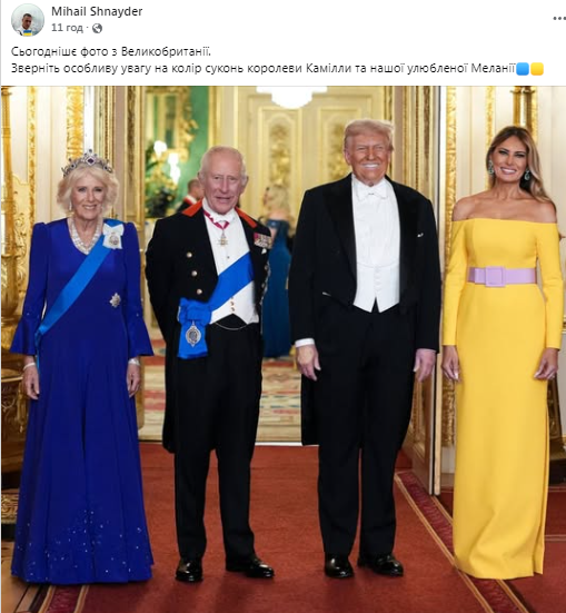 Зауважимо, під час державного банкету у Віндзорському замку дружина британського короля Чарльза ІІІ Камілла та перша леді США Меланія Трамп з’явилися у сукнях у кольорах українського прапора.