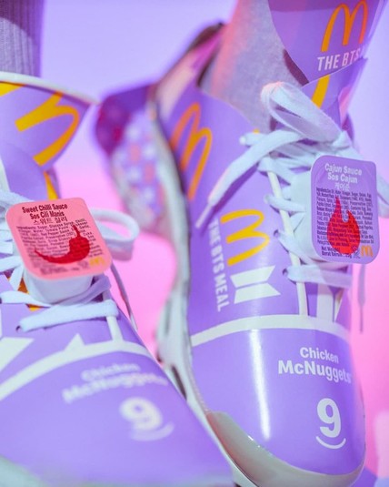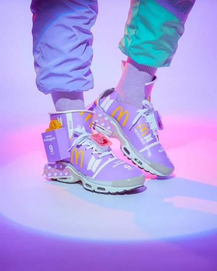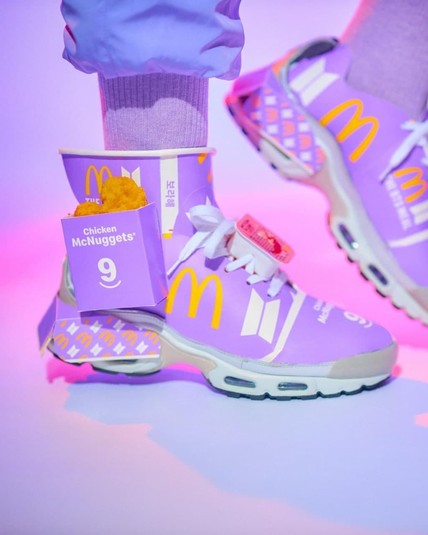 Основою оригінальних кросівок від Чуа стали Nike Air Max Plus TN. Чоловік прикрасив їх елементами нового упакування BTS Meal – колаборації McDonald’s із відомим K-pop гуртом.