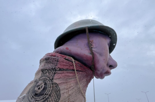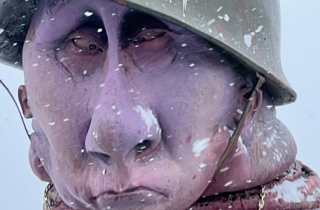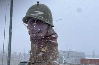 «Той шолом ніби символізує його присутність у бункері, оточений татуюваннями російського злочинця. Наприклад, вуха дуже маленькі, щоб було видно, що він нічого не чує, очі маленькі, бо він нічого не бачить, ніс довгий, тому що він багато бреше і лізе куди не треба», – пояснює скульптор.