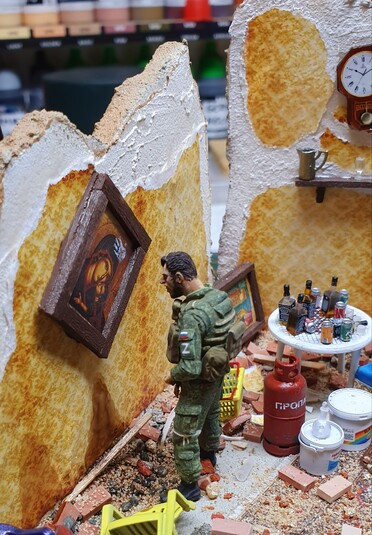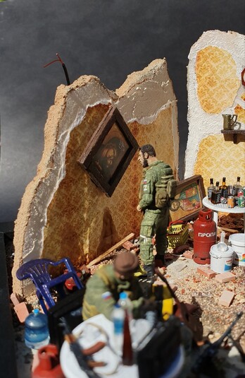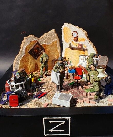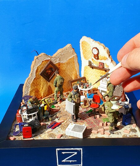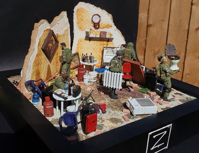 Моделіст зобразив російських військових, які під час війни в Україні грабують цивільних мешканців – крадуть меблі, сантехніку тощо.