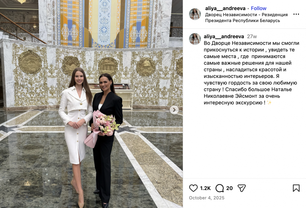 Повідомляється, що Алія – досвідчена учасниця конкурсів краси. У її послужному списку – «Міс Мінськ» та «Міс Білорусь». Саме після національного конкурсу вона потрапила до поля зору протоколу. Нещодавно дівчина закріпила успіх на міжнародній арені, здобувши титул другої віце-міс (третє місце) та приз глядацьких симпатій на так званому конкурсі «Міс Брікс».