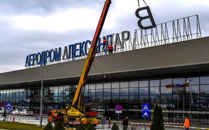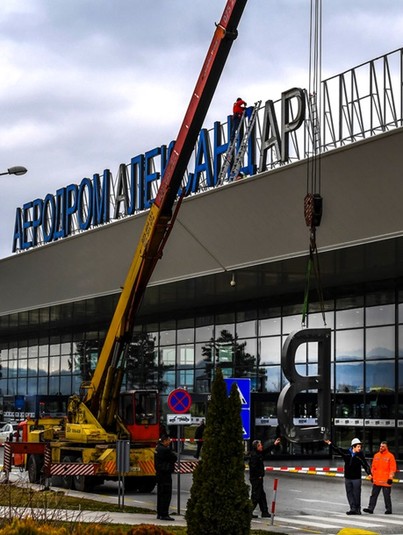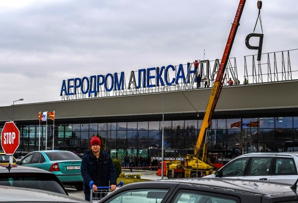 Зняття покажчика з ім'ям Олександра Македонського з головного аеропорту Македонії
