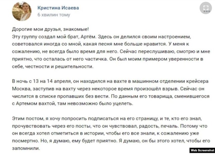 Користувач ВКонтакте Крістіна Ісаєва написала, що її брат Артем Мішустін, матрос 2003 року народження, під час влучення у крейсер був у машинному відділенні.