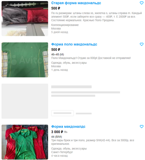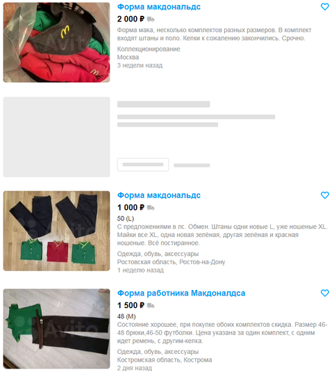 Більшість пропозицій – із Москви (та Підмосков’я) і Санкт-Петербурга. Але продають форму, у якій працювали у McDonald`s, люди із російської провінції – Ставрополя, Краснодара, Костроми, Ростова-на-Дону, Єкатеринбурга.