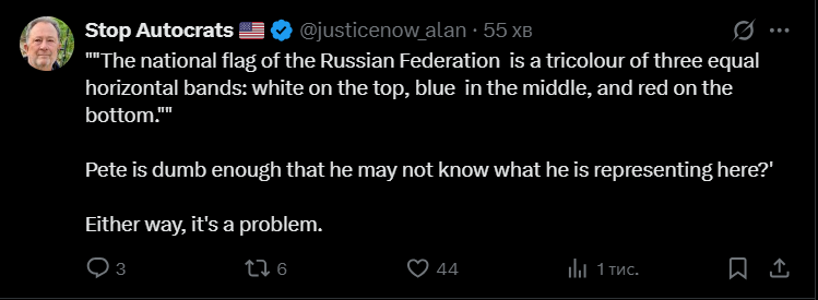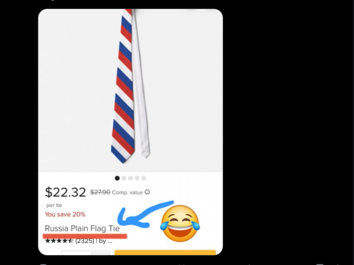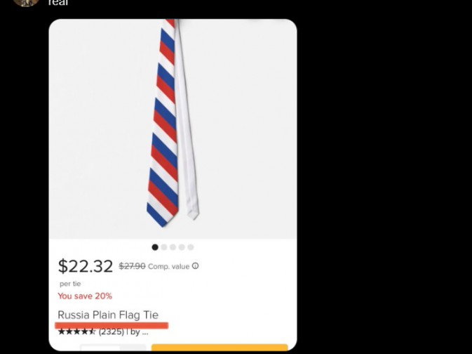 Ба більше, користувачі знайшли у продажу в США краватку, максимально схожу на ту, що одягнув Гегсет. І підпис під краваткою свідчить, що вона «у кольорах російського прапора».