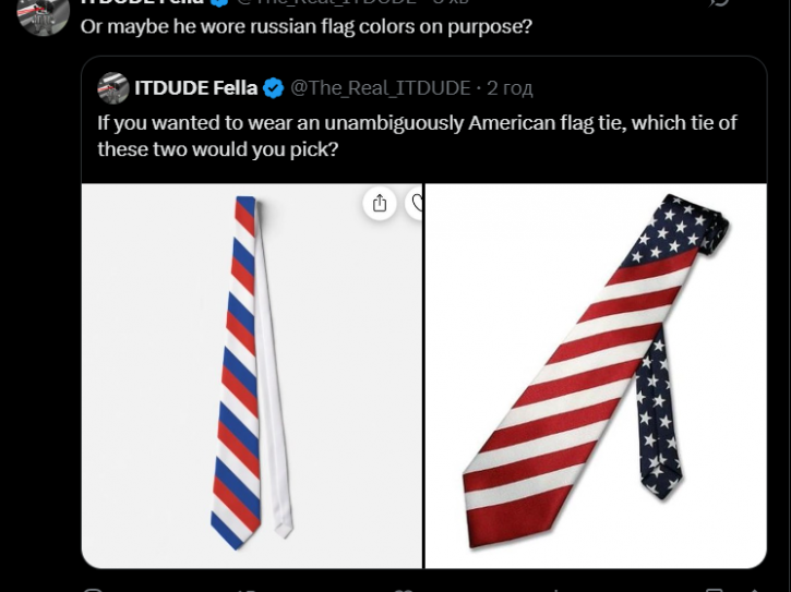 Утім, довіри в американців заява Венса не викликала. В коментарях доволі багато людей написали, що на краватці з американськими кольорами повинні були б розміщуватися й зірки. А порядок розміщення кольорів натякає саме на прапор РФ, а не на американський.