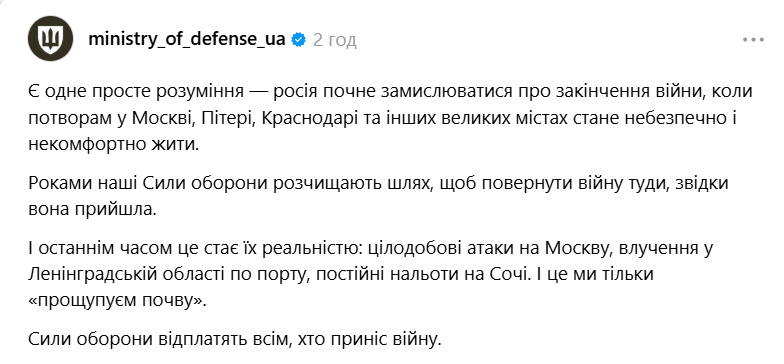 Росія почне серйозно розглядати завершення війни лише тоді, коли ситуація в її великих містах стане небезпечною та нестабільною. Про це повідомляє «Главком» з посиланням на заяву Міністерства оборони України.