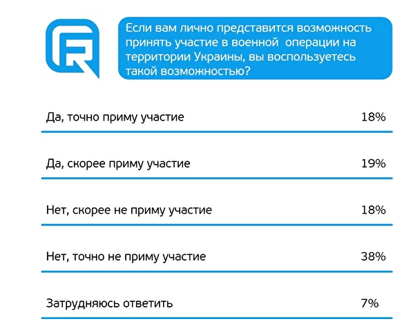 Крім того, про можливу власну участь у війні заявило лише 37% росіян, до того ж варіант «так, точно візьму участь» обрав лише кожен сьомий житель країни-агресора. Більше половини громадян РФ не збирається воювати в Україні.