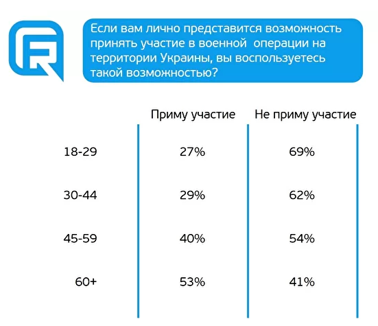 Вікові показники також досить красномовні – серед росіян віком від 18 до 44 років хоче воювати лише трохи більше чверті, тоді як серед росіян пенсійного віку бажаючих повоювати аж 53%.