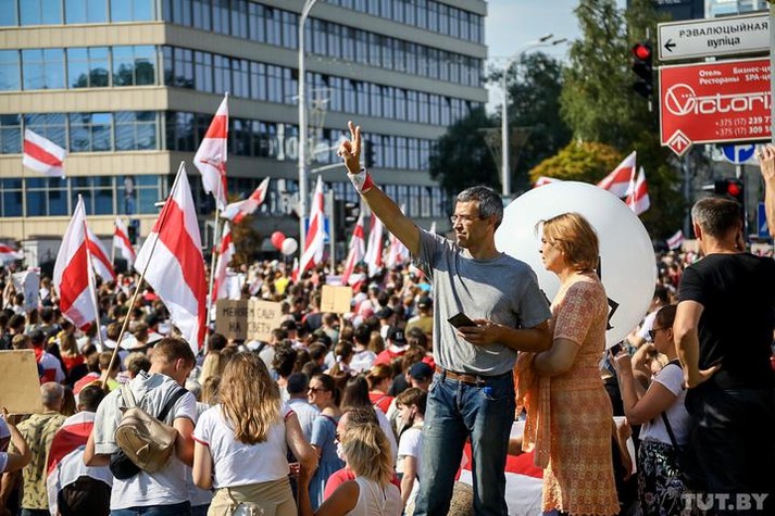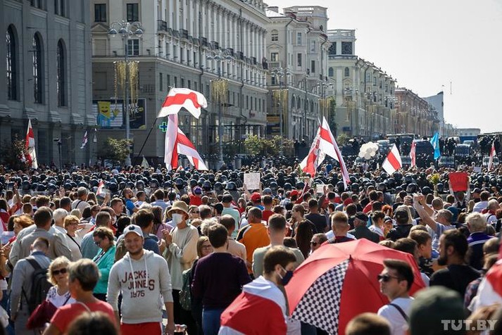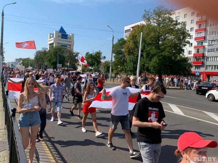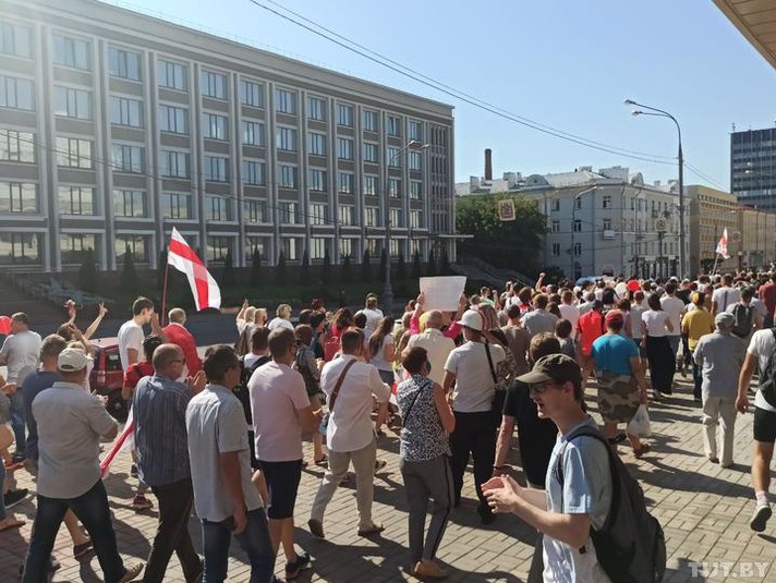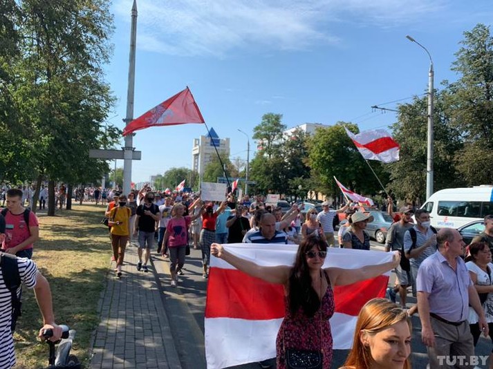 Марш мира и независимости в Минске. Десятки тысяч людей вышли на мирный протест. Каратели начали хватать. Протестующие пытаются отбивать захваченных. pic.twitter.com/zJlkeC7Ny7