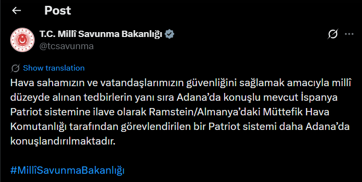 «З метою гарантування безпеки нашого повітряного простору та громадян, поряд з національними заходами, що вживаються, до наявної системи Patriot в Адані додатково розміщується ще одна система Patriot, визначена Об'єднаним повітряним командуванням у Рамштайні (Німеччина)», – йдеться у повідомленні.